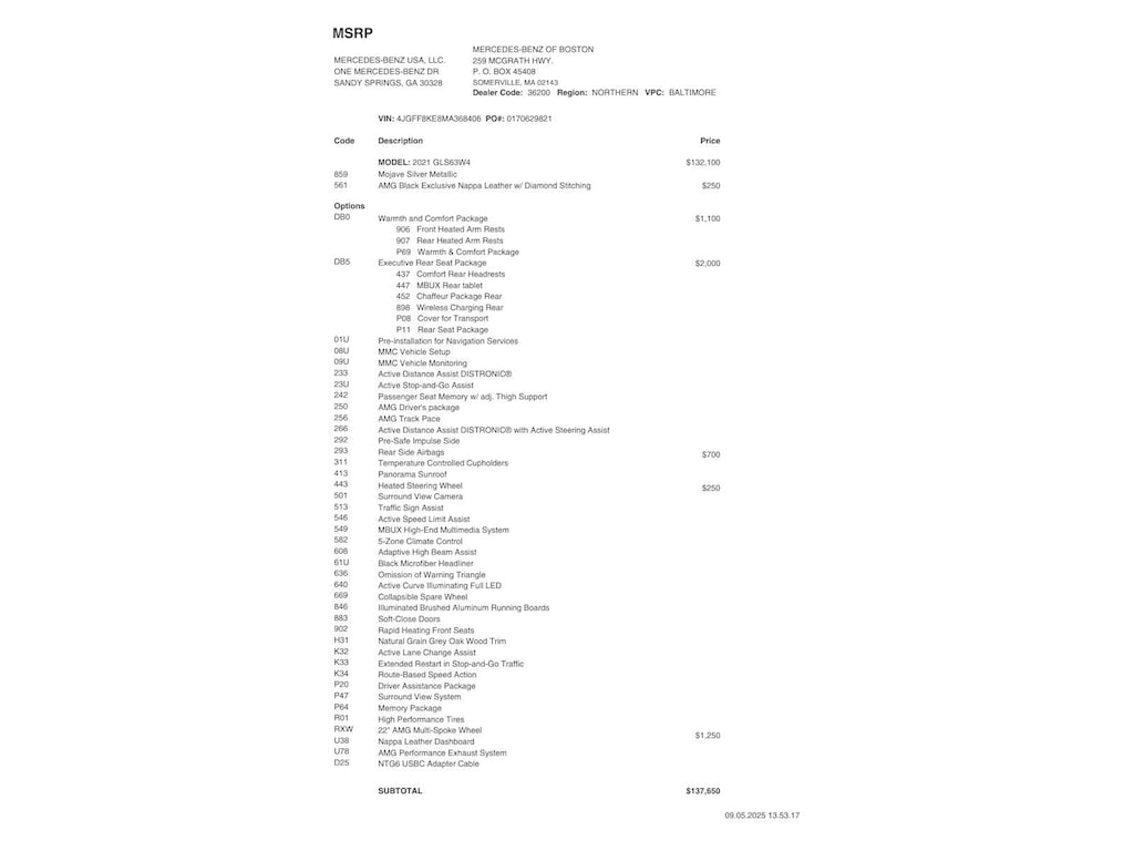 Service Work completed on this Mercedes-Benz AMG® GLS 63 included: Total Value: $5,131.97. Complete Multi-Point Inspection by factory trained technicians, Oil & Filter Change by a Factory Trained Technicians, Windshield Wiper Blades Replaced, Rear Glass Wiper Blade Replaced, 4 Tires Replaced, Front Brakes Pads Replaced, Front Brake Rotors Replaced, Cabin Air Filter Replaced, 4 Wheel Alignment, Professional Detailed Inside and Out.