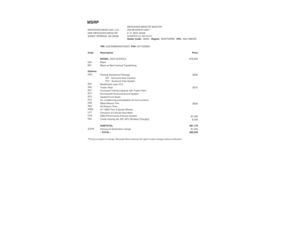 Service Work completed on this Mercedes-Benz AMG® GLE 53 included: Total Value: $1,729.76. Oil & Filter Change Using Original OEM Parts, Battery Voltage Test, Windshield Wiper Blades Replaced, Tires Inspected, 1 Tire Replaced, Brake Inspection, Cabin Air Filter Replaced, Emissions System Check, Professional Detailed Inside and Out, Function Test all Lights, Cooling System Inspection, Transmission Fluid Inspection, Differential Fluid Inspection, Function Test all Options & Accessories.