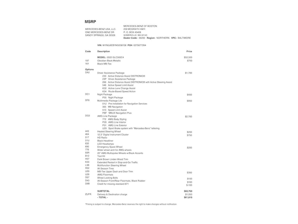 Service Work completed on this Mercedes-Benz GLC 300 included: Total Value: $1,126.40. Oil & Filter Change Using Original OEM Parts, Battery Voltage Test, Windshield Wiper Blades Replaced, Rear Glass Wiper Blade Replaced, Tires Inspected, Brake Inspection, Emissions System Check, Professional Detailed Inside and Out, Function Test all Lights, Cooling System Inspection, Transmission Fluid Inspection, Differential Fluid Inspection, Function Test all Options & Accessories.