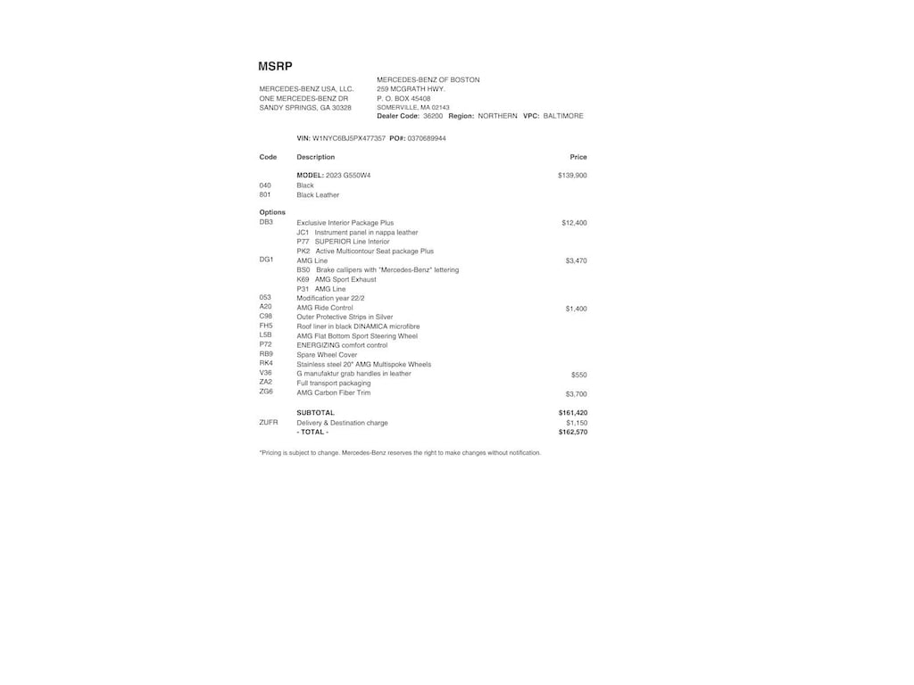 Service Work completed on this Mercedes-Benz G 550 included: Total Value: $3,082.10. Oil & Filter Change Using Original OEM Parts, Battery Voltage Test, Windshield Wiper Blades Replaced, Rear Glass Wiper Blade Replaced, Tires Inspected, 4 Tires Replaced, Brake Inspection, Engine Air Filter Replaced, Cabin Air Filter Replaced, 4 Wheel Alignment, Emissions System Check, Professional Detailed Inside and Out, Function Test all Lights, Cooling System Inspection, Transmission Fluid Inspection, Differential Fluid Inspection, Function Test all Options & Accessories.
