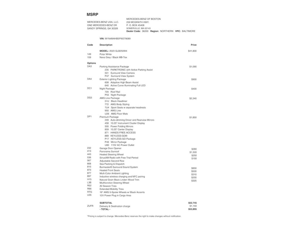 Service Work completed on this Mercedes-Benz GLB 250 included: Total Value: $2,697.95. Oil & Filter Change Using Original OEM Parts, Battery Voltage Test, Tires Inspected, 2 Tires Replaced, Brake Inspection, Rear Brakes Pads Replaced, Rear Brake Rotors Replaced, 4 Wheel Alignment, Emissions System Check, Professional Detailed Inside and Out, Function Test all Lights, Cooling System Inspection, Transmission Fluid Inspection, Differential Fluid Inspection, Function Test all Options & Accessories.