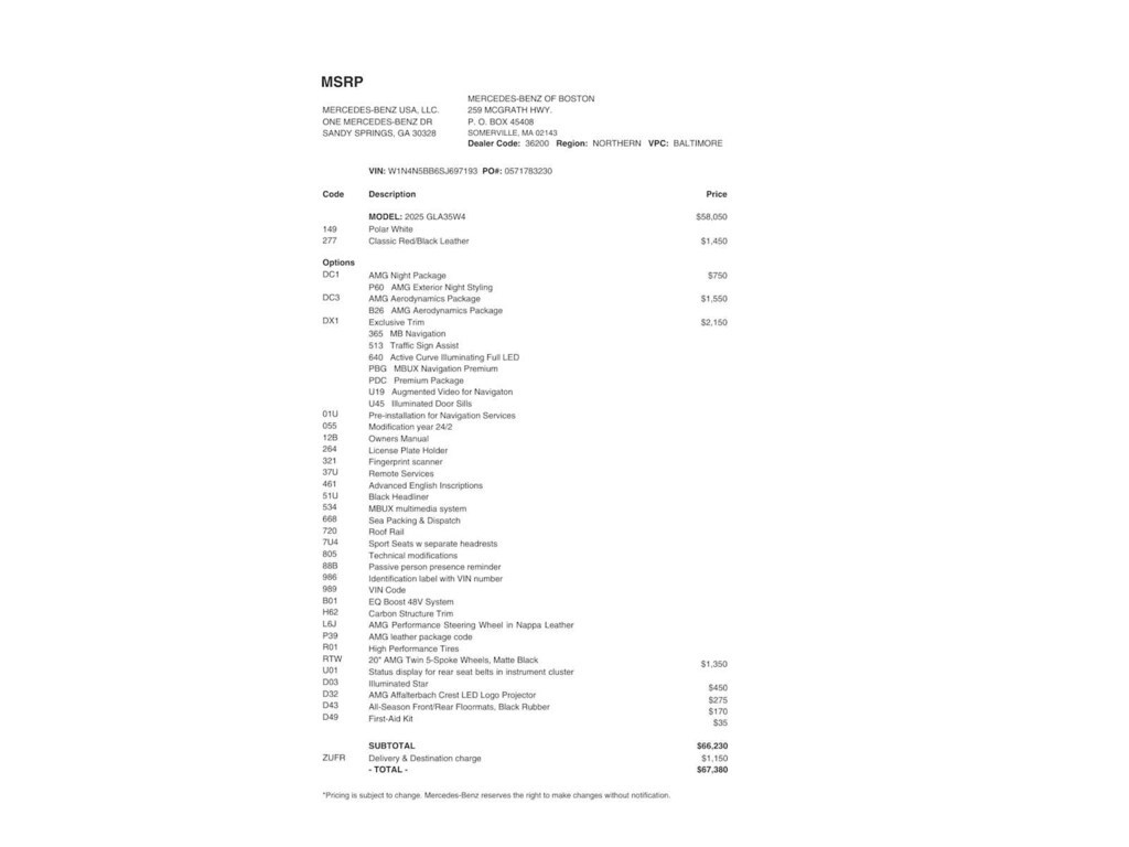 Service Work completed on this Mercedes-Benz AMG® GLA 35 included: Oil & Filter Change Using Original OEM Parts, Battery Voltage Test, Tires Inspected, Brake Inspection, Emissions System Check, Professional Detailed Inside and Out, Function Test all Lights, Cooling System Inspection, Transmission Fluid Inspection, Differential Fluid Inspection, Function Test all Options & Accessories.