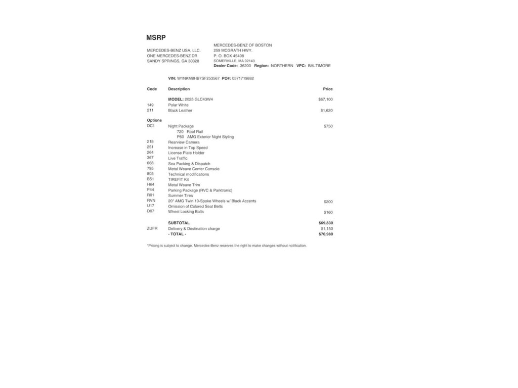 Service Work completed on this Mercedes-Benz AMG® GLC 43 included: Oil & Filter Change Using Original OEM Parts, Battery Voltage Test, Tires Inspected, Brake Inspection, Emissions System Check, Professional Detailed Inside and Out, Function Test all Lights, Cooling System Inspection, Transmission Fluid Inspection, Differential Fluid Inspection, Function Test all Options & Accessories.