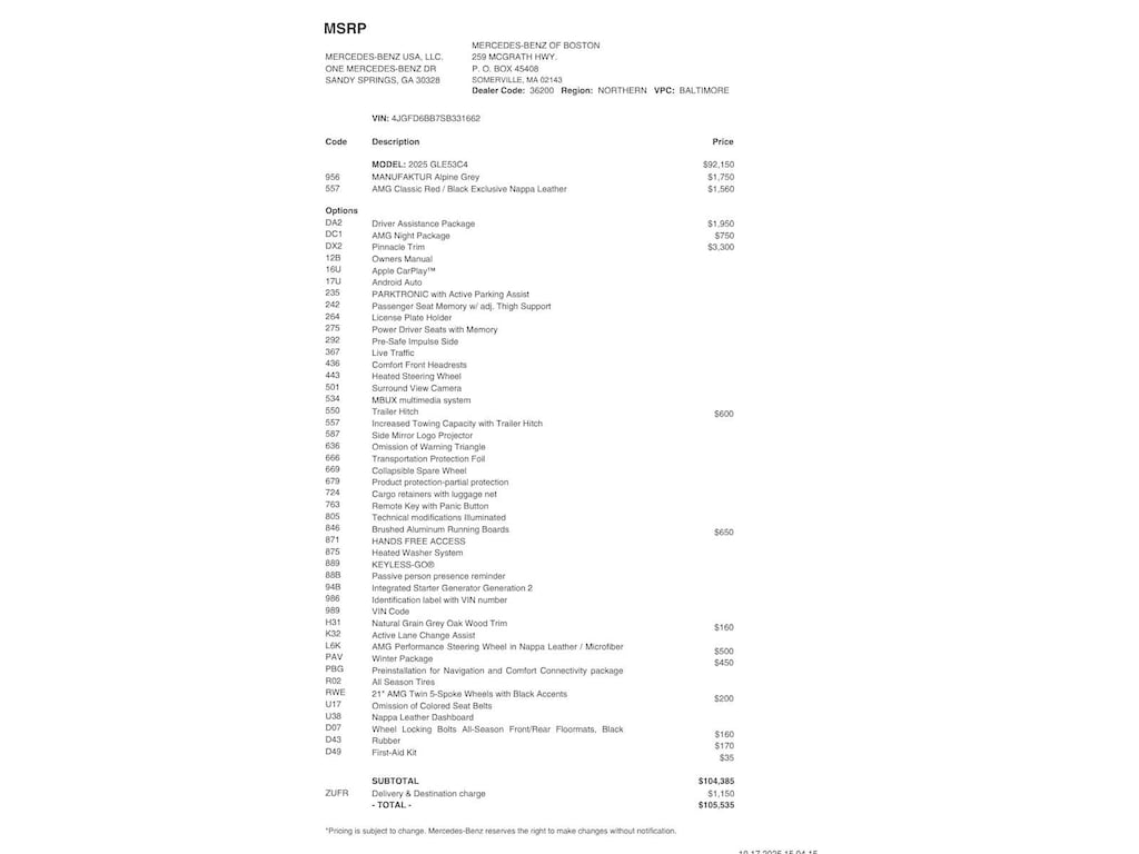 PINNACLE TRIM: Head-Up Display, MBUX Interior Assistant, Temperature Controlled Cupholders, Multicontour Front Seats w/Massage Function, Front Door AMG® Logo Projectors, AIR-BALANCE Package w/Fragrance, cabin air purification and fragrance system, DRIVER ASSISTANCE PACKAGE: Active Lane Keeping Assist, Active Distance Assist DISTRONIC®, Active Steering Assist, Active Stop & Go Assist, Active Speed Limit Assist, Extended Restart in Stop & Go Traffic, Active Lane Change Assist, Route-Based Speed Adaptation, AMG® NIGHT PACKAGE: trim on A-wing, rear apron, tailpipes, front splitter and window frames in high-gloss black, ILLUMINATED RUNNING BOARDS, TRAILER HITCH: Increased Towing Capacity, AMG® PERFORMANCE STEERING WHEEL IN NAPPA/MICROFIBER, WINTER PACKAGE: Heated Windshield Washer System, Heated Steering Wheel, WHEELS: 21 AMG® TWIN 5-SPOKE MATTE BLACK: 21 x 10J (front) and 21 x 11J (rear).
