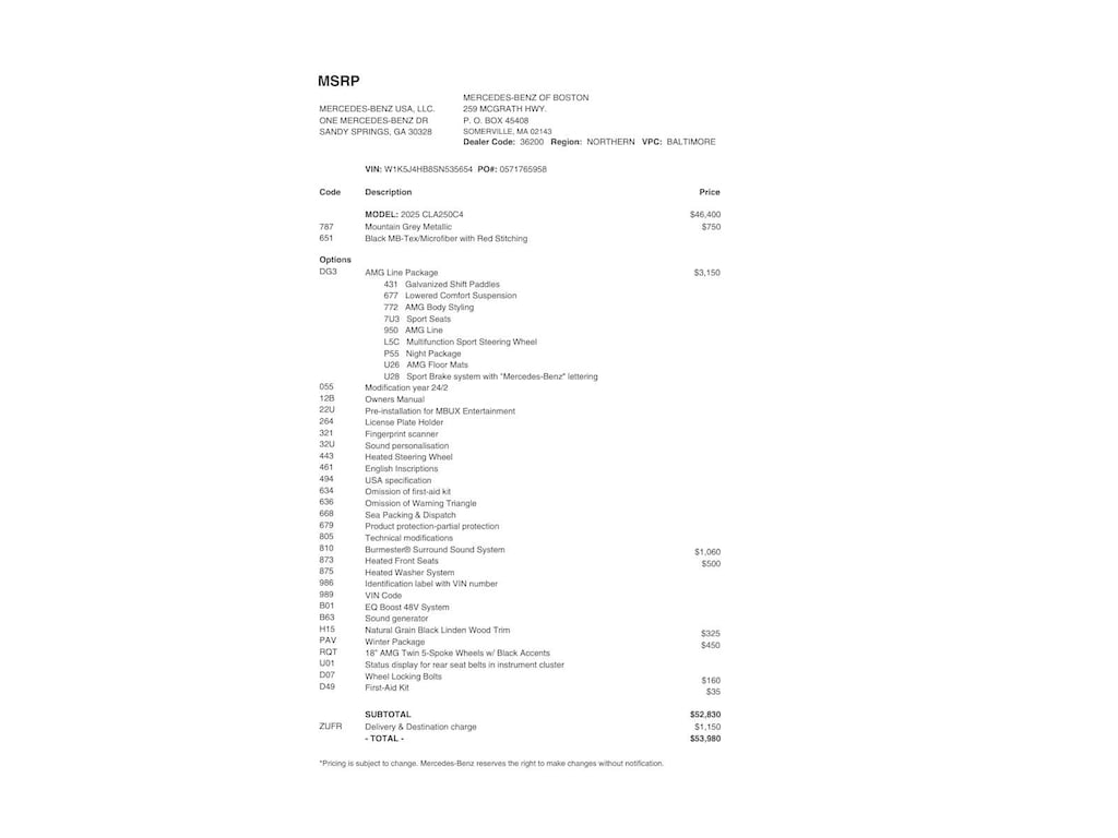 AMG® NIGHT PACKAGE: AMG® Body Styling, Sport Seats, Lowered Comfort Suspension, AMG® Floor Mats, Sport Brake System w/Mercedes-Benz Lettering, Multifunction Sport Steering Wheel, Burmester® SURROUND SOUND W/DOLBY ATMOS, HEATED FRONT SEATS, WINTER PACKAGE: Heated Washer System, Heated Steering Wheel, NATURAL GRAIN BLACK LINDEN WOOD INTERIOR TRIM.
