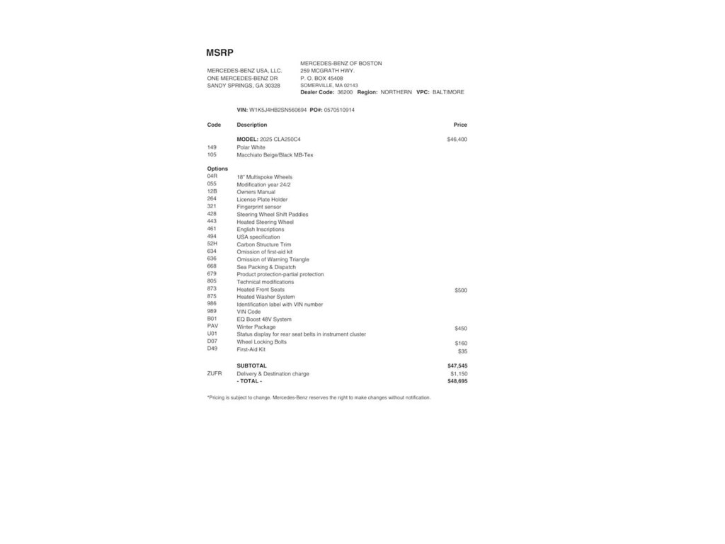 Service Work completed on this Mercedes-Benz CLA 250 included: Oil & Filter Change Using Original OEM Parts, Battery Voltage Test, Tires Inspected, Brake Inspection, Emissions System Check, Professional Detailed Inside and Out, Function Test all Lights, Cooling System Inspection, Transmission Fluid Inspection, Differential Fluid Inspection, Function Test all Options & Accessories.