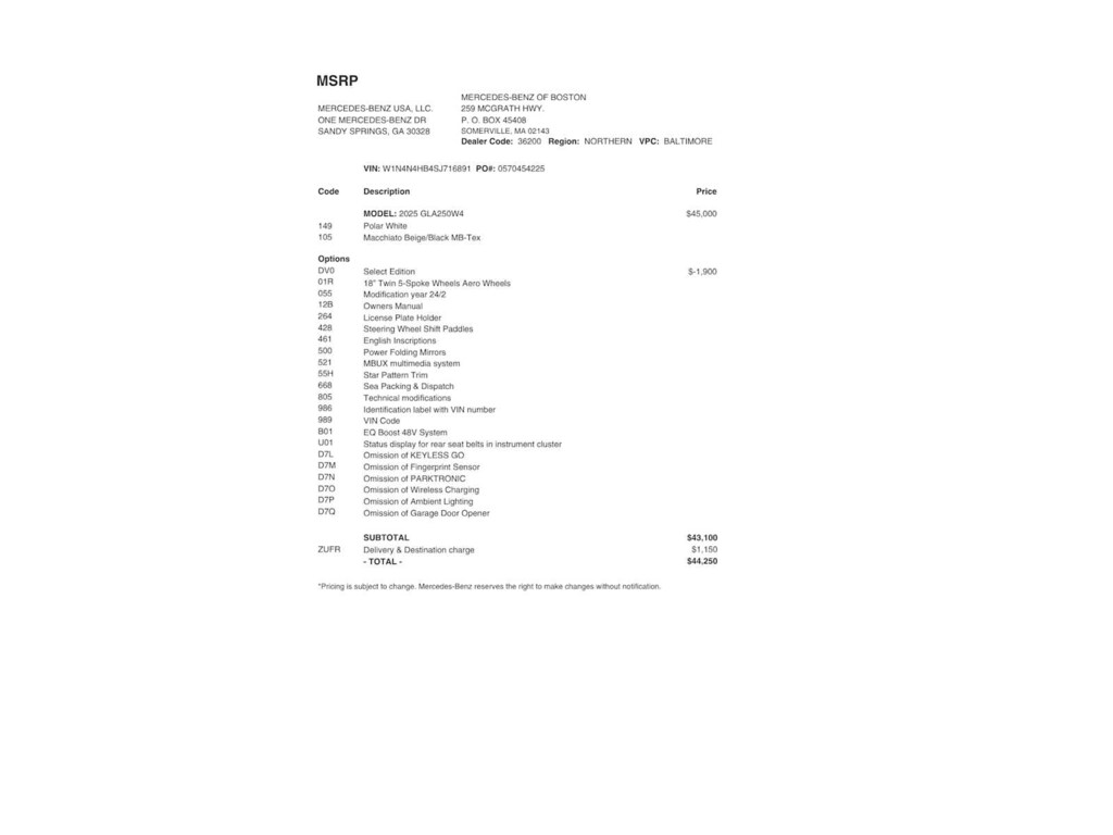 Service Work completed on this Mercedes-Benz GLA 250 included: Oil & Filter Change Using Original OEM Parts, Battery Voltage Test, Tires Inspected, Brake Inspection, Emissions System Check, Professional Detailed Inside and Out, Function Test all Lights, Cooling System Inspection, Transmission Fluid Inspection, Differential Fluid Inspection, Function Test all Options & Accessories.