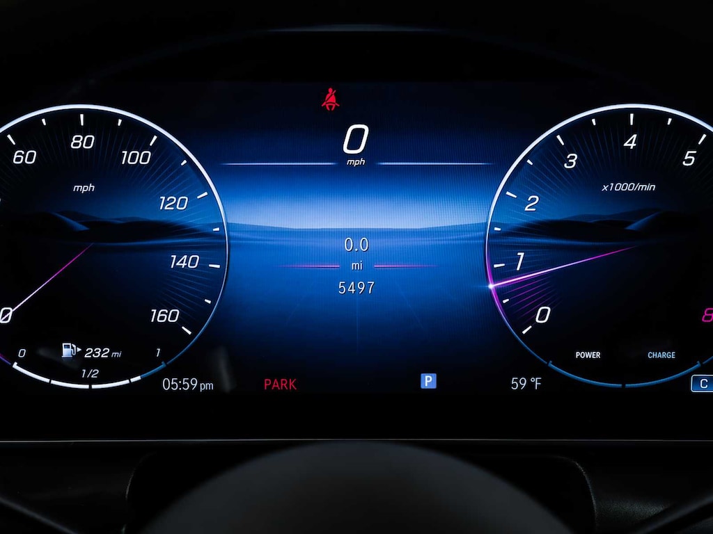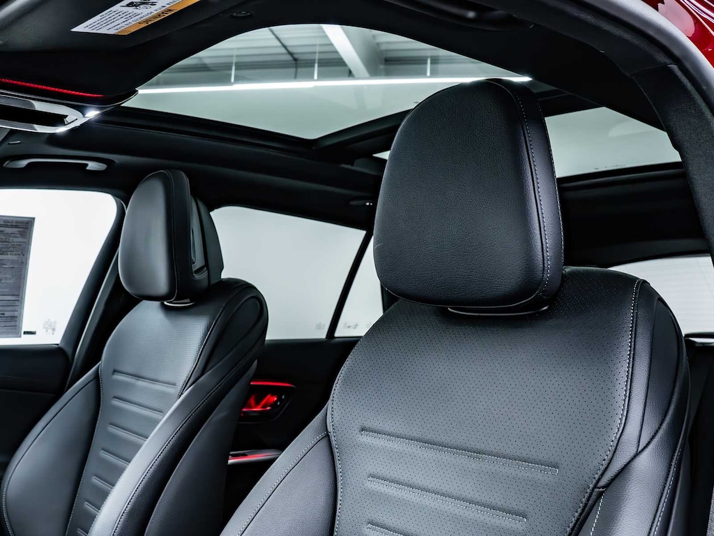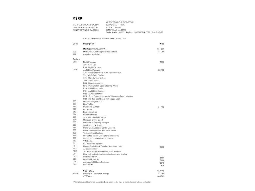 AMG® LINE: AMG® Line Body Styling, AMG® Line Interior, MB-Tex Instrument Panel, beltlines in black Nappa look, AMG® Line Floor Mats, Wheel Arch Trim Painted in Body Color, Flat-Bottom Multifunction Sport Steering Wheel, Perforated Brake Discs, Mercedes-Benz lettered calipers, AMG® Line Exterior, PANORAMA SUNROOF, ILLUMINATED STAR, ANIMATED LED LOGO PROJECTOR, NIGHT PACKAGE: High-Gloss Black Elements, front wing, grille lamellas, rear diffuser insert, exterior mirrors, beltline and window trim, Black Roof Rails, NATURAL GRAIN BLACK WOOD W/ALUMINUM LINES TRIM.