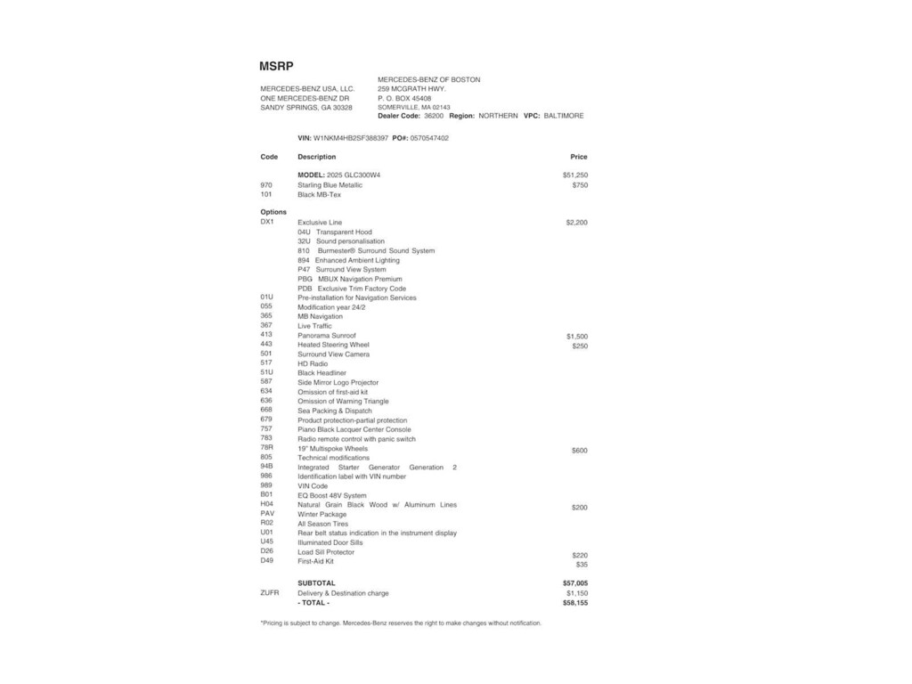EXCLUSIVE TRIM: Surround View System, Enhanced Ambient Lighting, MB Navigation, Burmester® 3D Surround Sound System, 15 high-performance speakers, Sound Personalization, Illuminated Door Sills, GUARD 360, picture taking functionality, PANORAMA SUNROOF, WHEELS: 19 MULTISPOKE: 8J x 19 ET 32.5, Tires: 235/55R19, HEATED STEERING WHEEL, NATURAL GRAIN BLACK WOOD W/ALUMINUM LINES TRIM.