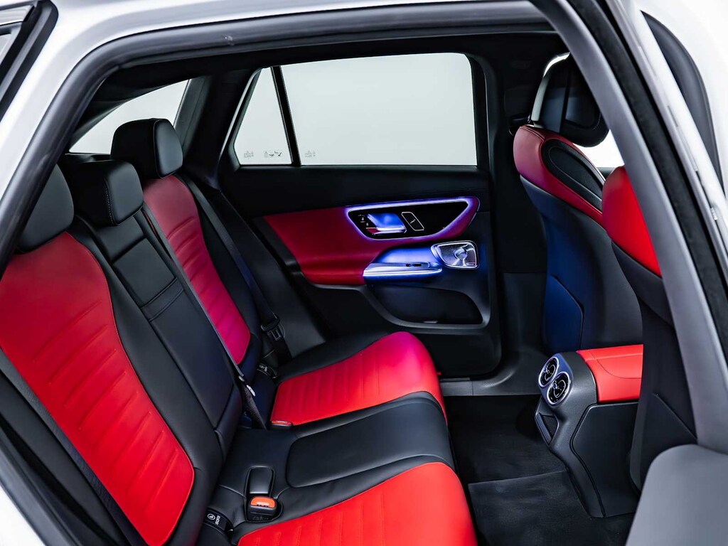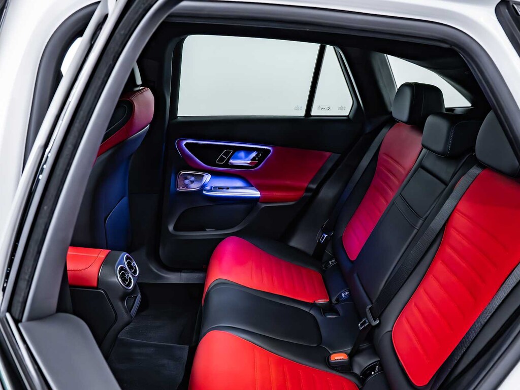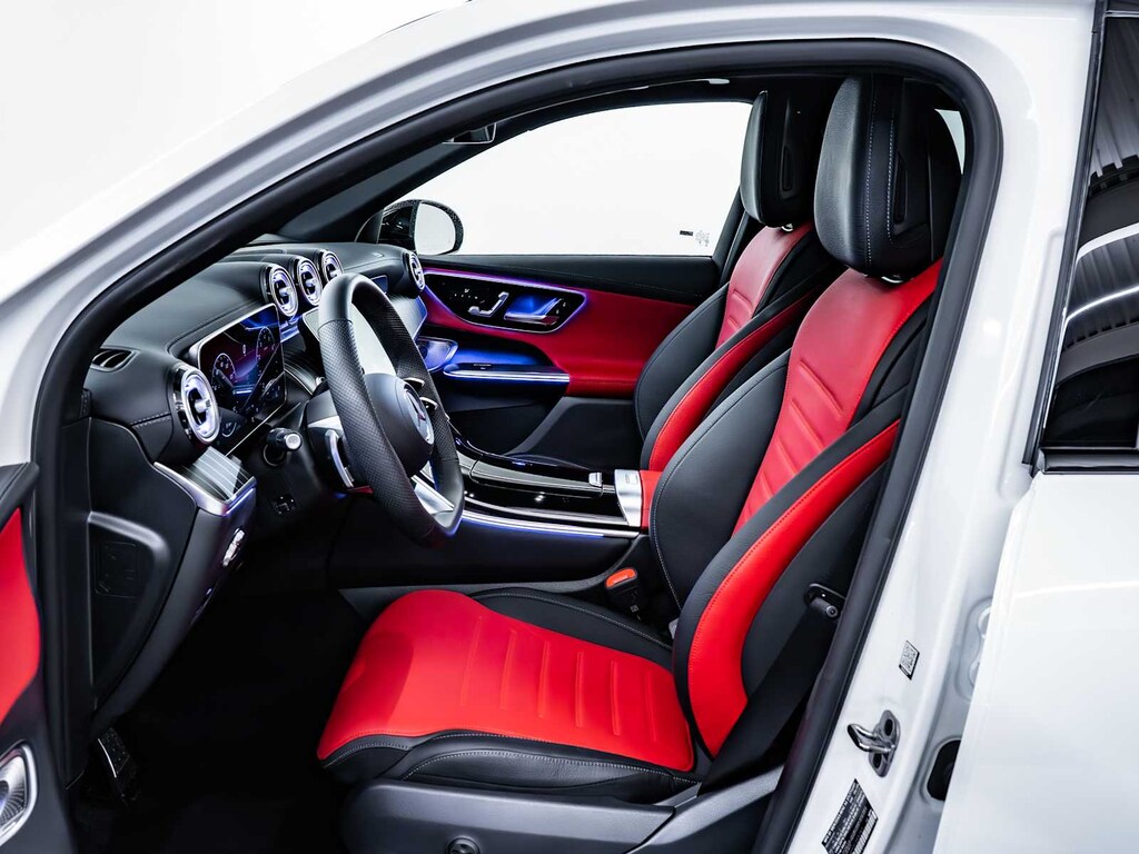 Blind Spot Monitor, Child Safety Locks, Electronic Stability Control, Brake Assist, 4-Wheel ABS, Tire Pressure Monitoring System, 4-Wheel Disc Brakes Mercedes-Benz GLC 300 with Polar White exterior and AMG® Power Red/Black interior features a 4 Cylinder Engine with 255 HP at 5800 RPM*.
