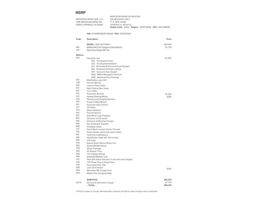 Service Work completed on this Mercedes-Benz GLC 350e included: Oil & Filter Change Using Original OEM Parts, Battery Voltage Test, Tires Inspected, Brake Inspection, Emissions System Check, Professional Detailed Inside and Out, Function Test all Lights, Cooling System Inspection, Transmission Fluid Inspection, Differential Fluid Inspection, Function Test all Options & Accessories.