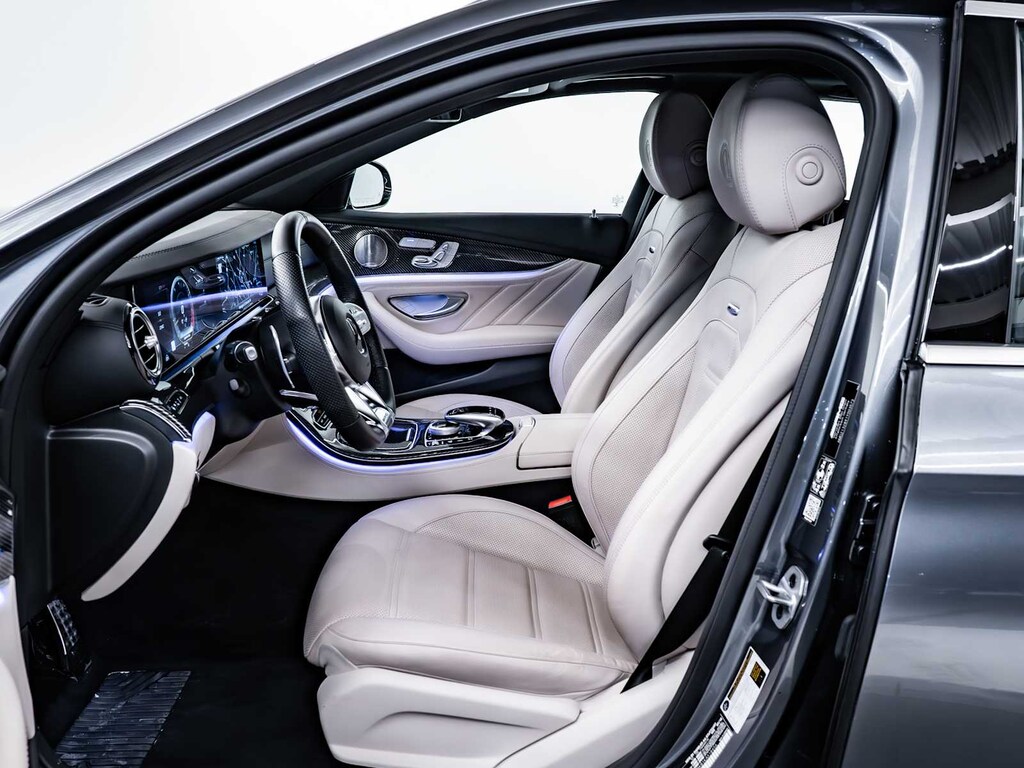 Cross-Traffic Alert, Lane Keeping Assist, Blind Spot Monitor, Child Safety Locks, Electronic Stability Control, Brake Assist, 4-Wheel ABS, 4-Wheel Disc Brakes, Tire Pressure Monitoring System Mercedes-Benz AMG® E 63 S with Selenite Grey Metallic exterior and Macchiato Beige/Black interior features a 8 Cylinder Engine with 603 HP at 5750 RPM*. Excellent Condition