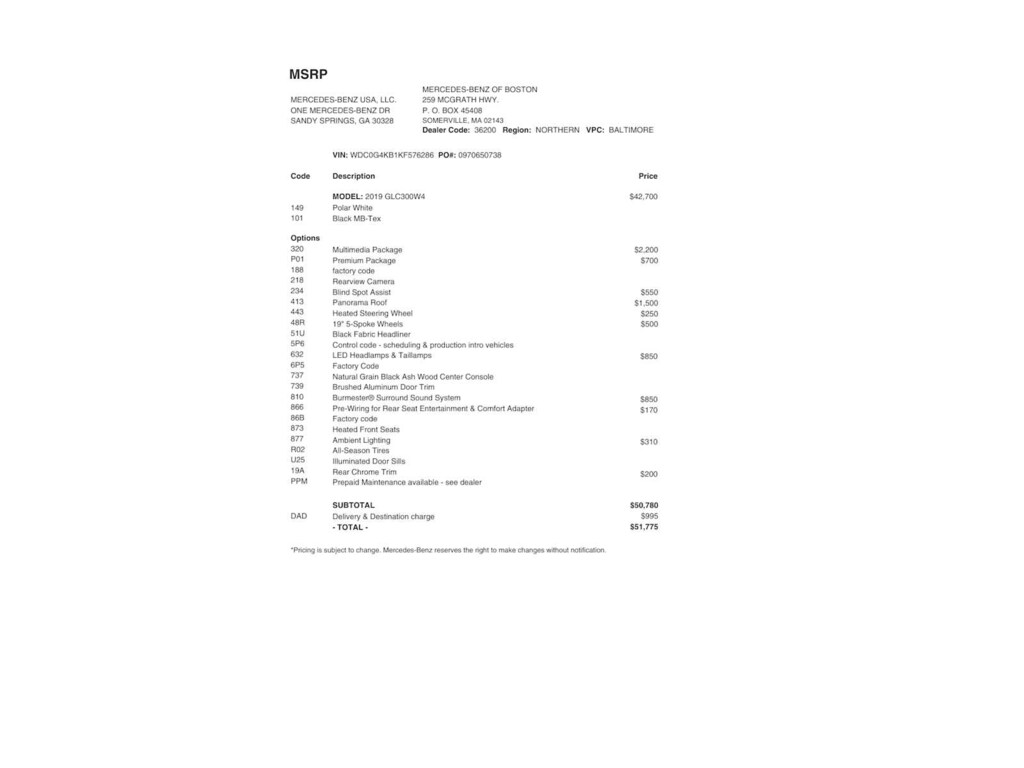 Service Work completed on this Mercedes-Benz GLC 300 included: Total Value: $1,231.49. Oil & Filter Change Using Original OEM Parts, Battery Voltage Test, Windshield Wiper Blades Replaced, Rear Glass Wiper Blade Replaced, Tires Inspected, Brake Inspection, Cabin Air Filter Replaced, Emissions System Check, Professional Detailed Inside and Out, Function Test all Lights, Cooling System Inspection, Transmission Fluid Inspection, Differential Fluid Inspection, Function Test all Options & Accessories.