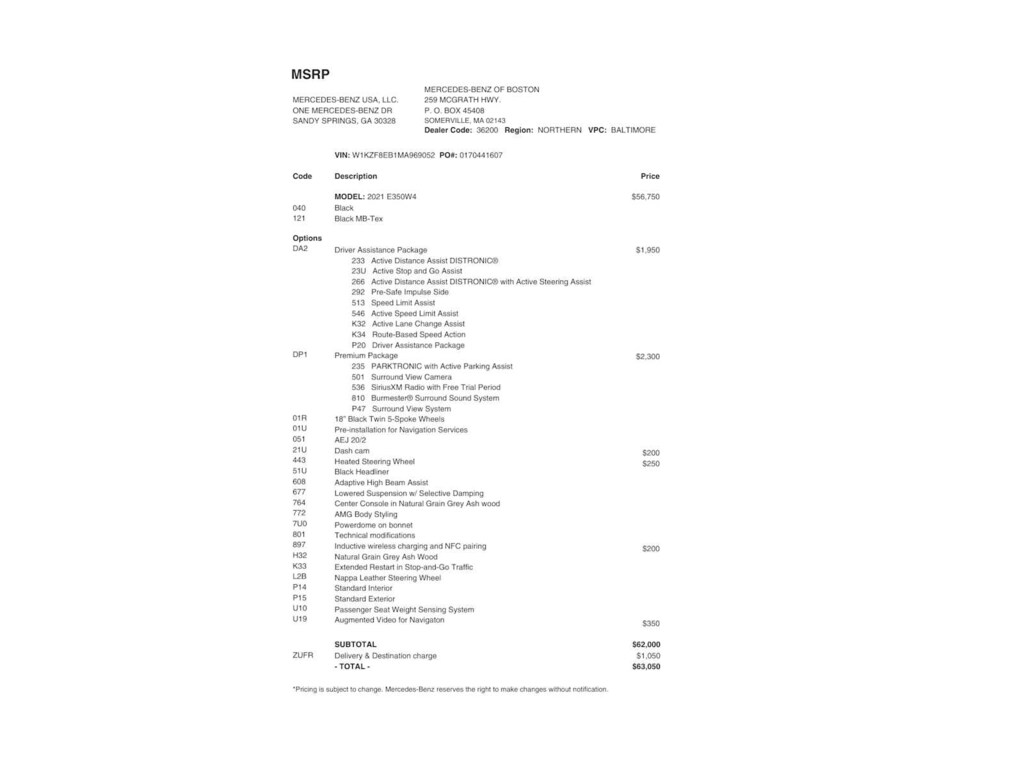 Service Work completed on this Mercedes-Benz E 350 included: Total Value: $841.45. Oil & Filter Change Using Original OEM Parts, Battery Voltage Test, Windshield Wiper Blades Replaced, Tires Inspected, Brake Inspection, Emissions System Check, Professional Detailed Inside and Out, Function Test all Lights, Cooling System Inspection, Transmission Fluid Inspection, Differential Fluid Inspection, Function Test all Options & Accessories.