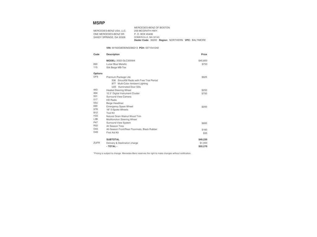 Service Work completed on this Mercedes-Benz GLC 300 included: Total Value: $1,121.12. Oil & Filter Change Using Original OEM Parts, Battery Voltage Test, Windshield Wiper Blades Replaced, Rear Glass Wiper Blade Replaced, Tires Inspected, Brake Inspection, Emissions System Check, Professional Detailed Inside and Out, Function Test all Lights, Cooling System Inspection, Transmission Fluid Inspection, Differential Fluid Inspection, Function Test all Options & Accessories.
