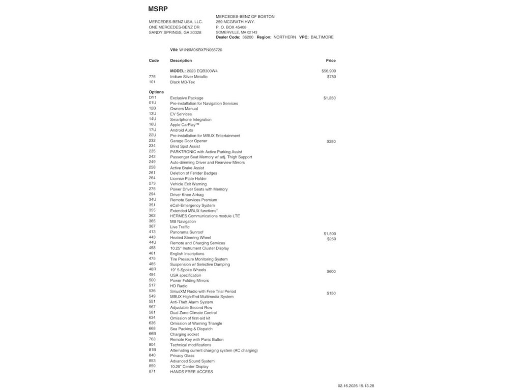 Service Work completed on this Mercedes-Benz EQB 300 included: Total Value: $1,360.95. Oil & Filter Change Using Original OEM Parts, Battery Voltage Test, Windshield Wiper Blades Replaced, Rear Glass Wiper Blade Replaced, Tires Inspected, Wheel/Tire Balance, Brake Inspection, Cabin Air Filter Replaced, Emissions System Check, Professional Detailed Inside and Out, Function Test all Lights, Cooling System Inspection, Transmission Fluid Inspection, Differential Fluid Inspection, Function Test all Options & Accessories.