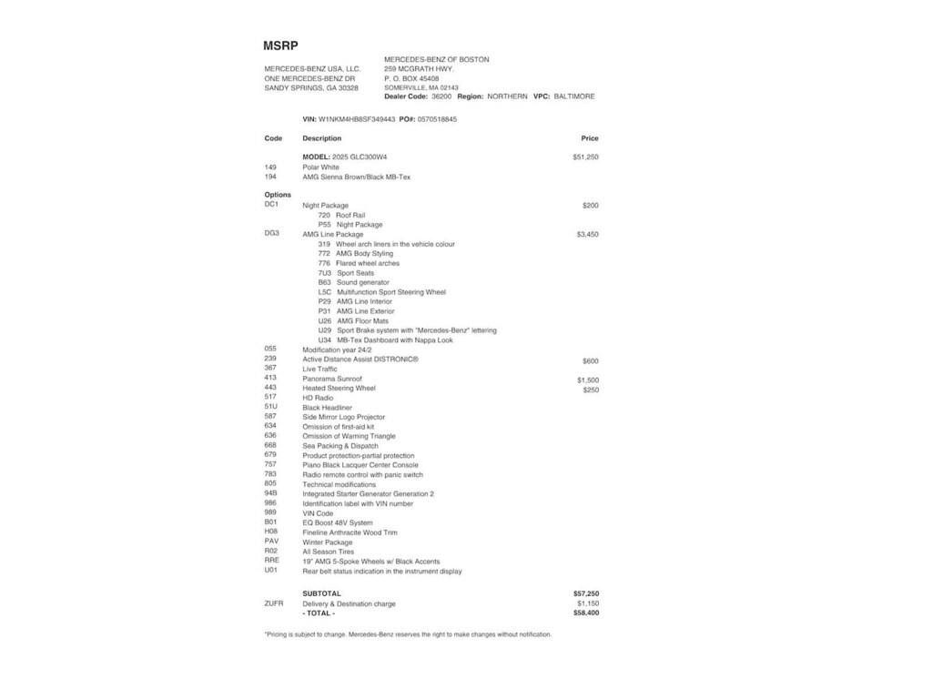 AMG® LINE: AMG® Line Body Styling, AMG® Line Interior, MB-Tex Instrument Panel, beltlines in black Nappa look, AMG® Line Floor Mats, Wheel Arch Trim Painted in Body Color, Flat-Bottom Multifunction Sport Steering Wheel, Perforated Brake Discs, Mercedes-Benz lettered calipers, AMG® Line Exterior, PANORAMA SUNROOF, ACTIVE DISTANCE ASSIST DISTRONIC®, HEATED STEERING WHEEL, NIGHT PACKAGE: High-Gloss Black Elements, front wing, grille lamellas, rear diffuser insert, exterior mirrors, beltline and window trim, Black Roof Rails.