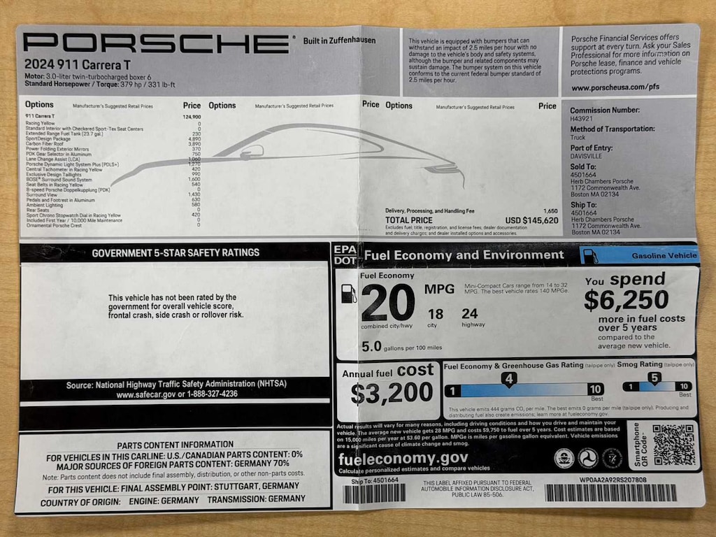 Electronic Stability Control, Brake Assist, 4-Wheel ABS, 4-Wheel Disc Brakes, Tire Pressure Monitoring System Porsche Carrera T with Racing Yellow exterior and Black interior features a Flat 6 Cylinder Engine with 379 HP at 6500 RPM*.