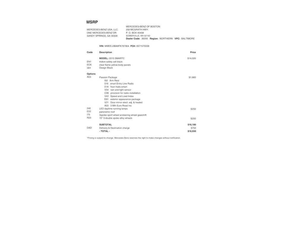Service Work completed on this smart fortwo included: Total Value: $1,548.91. Oil & Filter Change Using Original OEM Parts, Battery Voltage Test, Windshield Wiper Blades Replaced, Rear Glass Wiper Blade Replaced, Tires Inspected, Brake Inspection, Front Brakes Pads Replaced, Front Brake Rotors Replaced, Emissions System Check, Professional Detailed Inside and Out, Function Test all Lights, Cooling System Inspection, Transmission Fluid Inspection, Differential Fluid Inspection, Function Test all Options & Accessories.